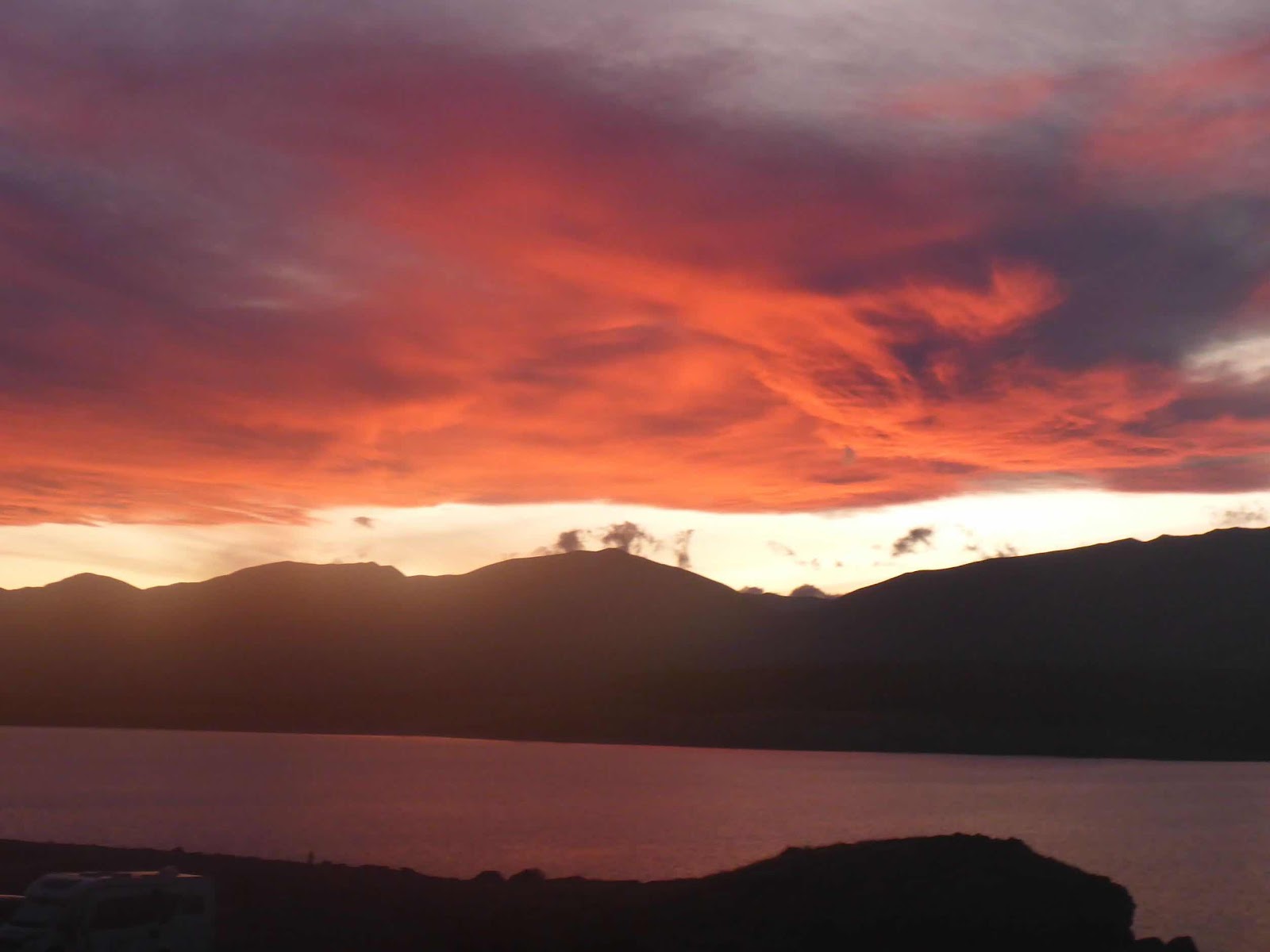 Gestern Abend gab es noch den spektakulärsten Sonnenuntergang, den ich je gesehen habe. Tiefrote Wolken schwebten sehr bedrohlich über den Bergen. Unheimlich.